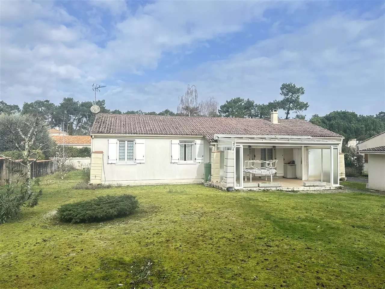SAINT GEORGES DE DIDONNE, 200m PLAGE, quartier de Suzac, maison de plain pied construite à 2001, 100m² hab ( terrasse couverte) comprenant entrée, wc, 3 grandes chambres, salle de bains, pièce de vie de 35m² ouvrant sur une terrasse couverte de 29m², cuisine aménagée.