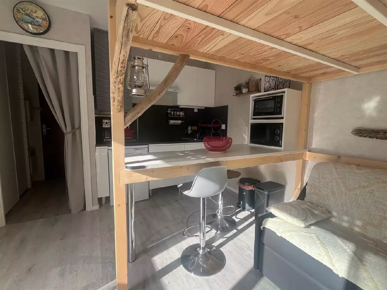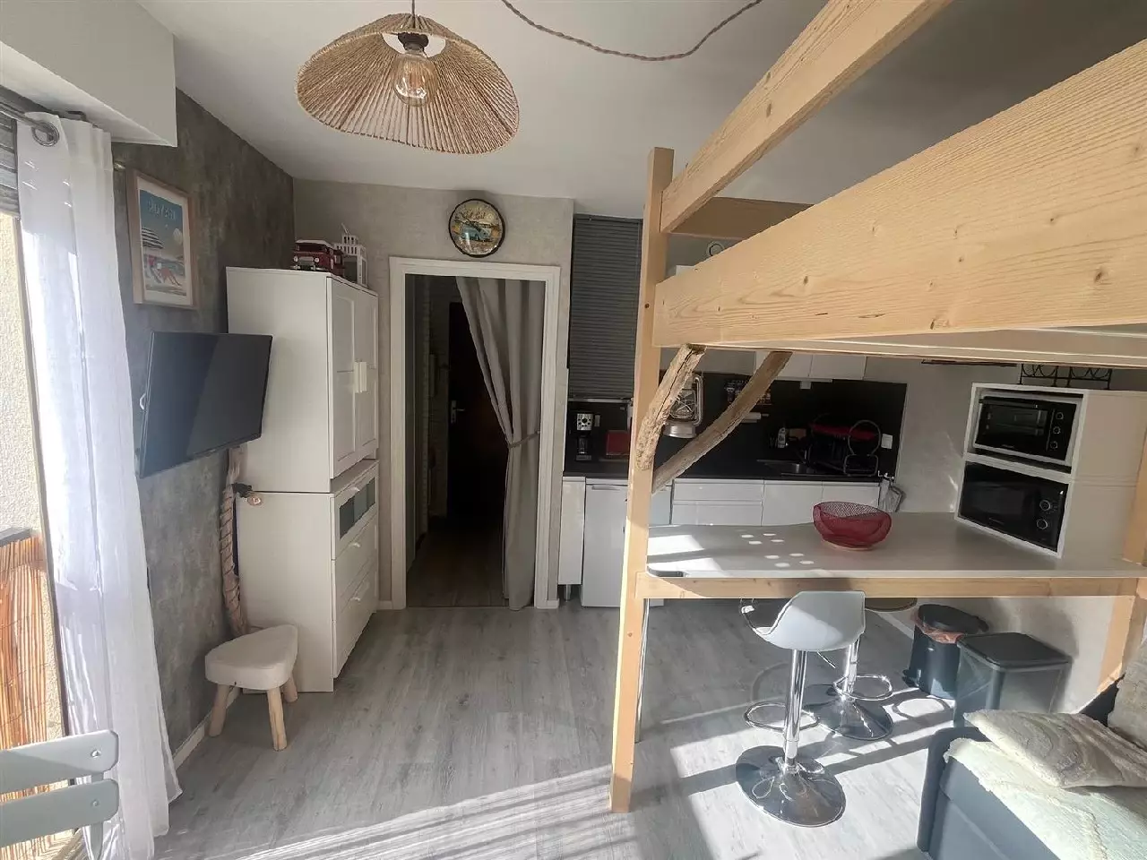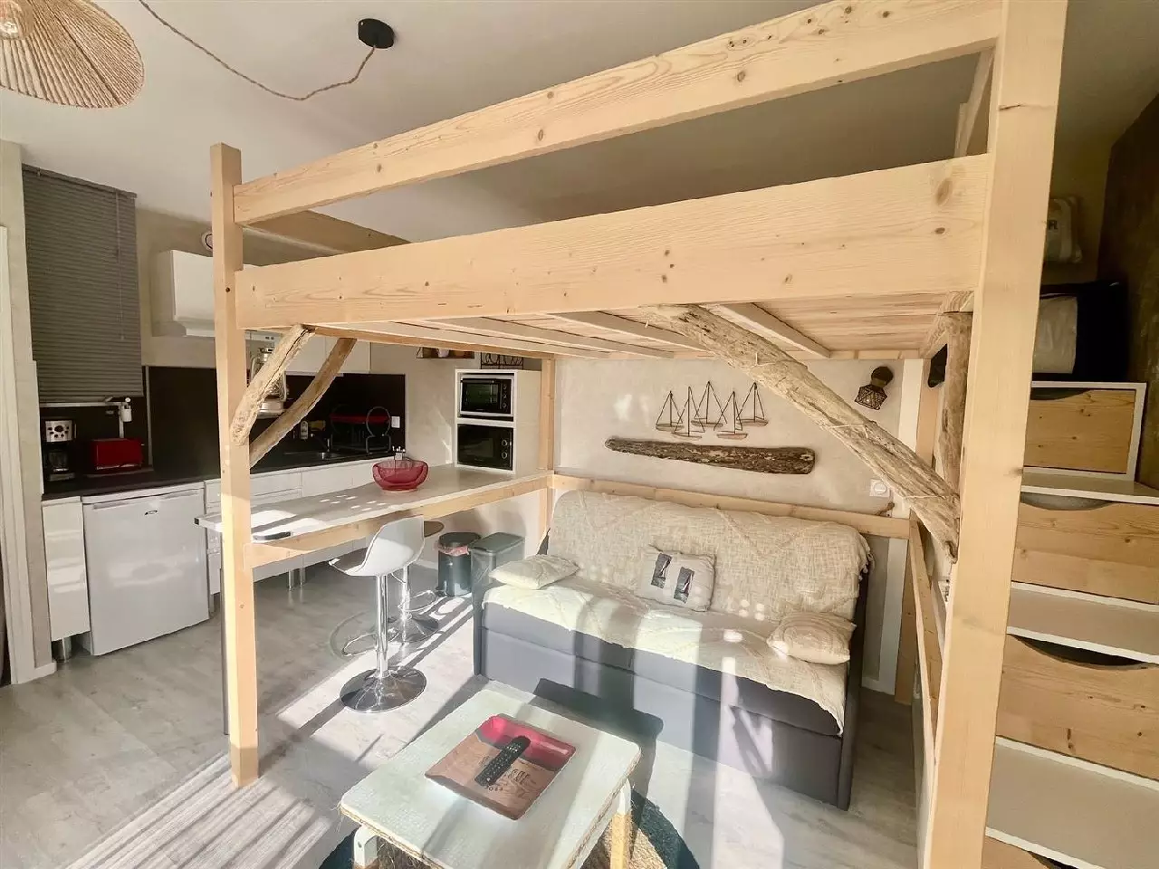Entrée avec placard, salle d'eau, wc, pièce de vie avec cuisine équipée et espace nuit en mezzanine faite sur mesure.
