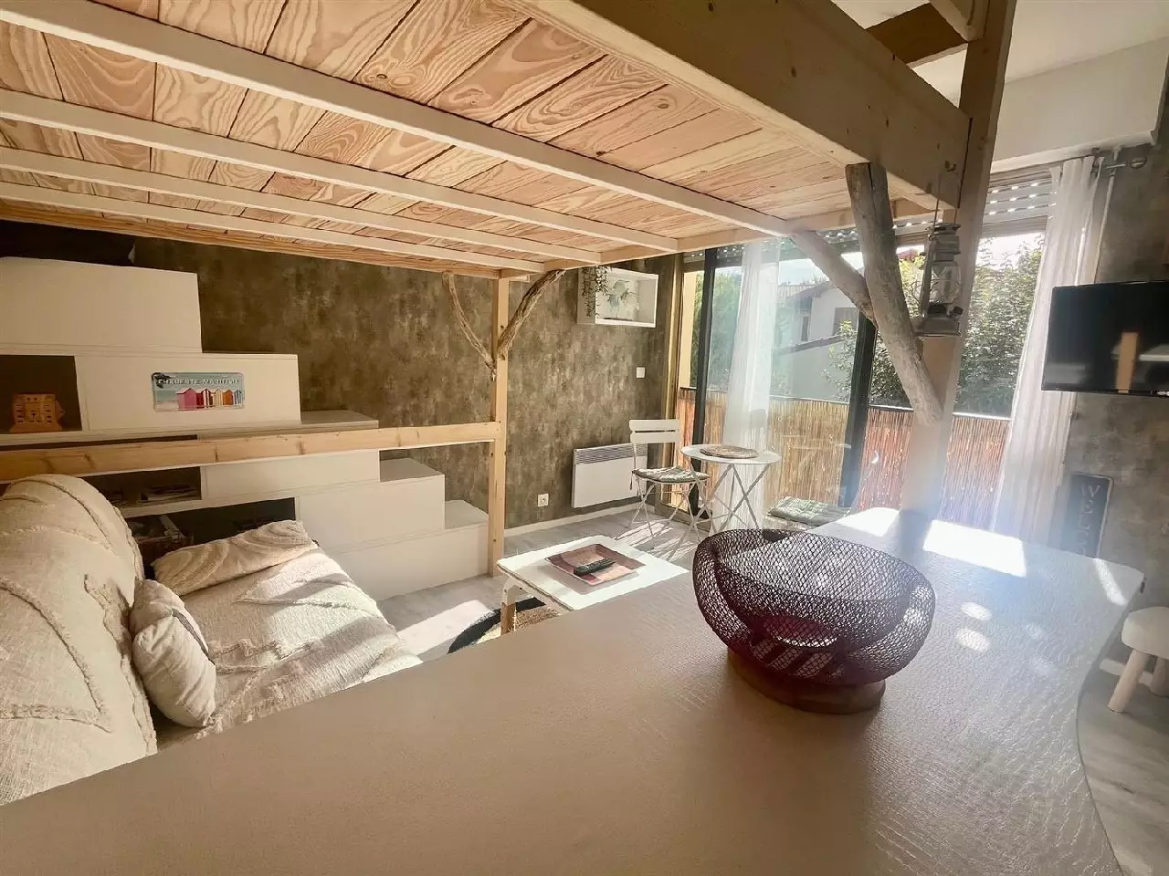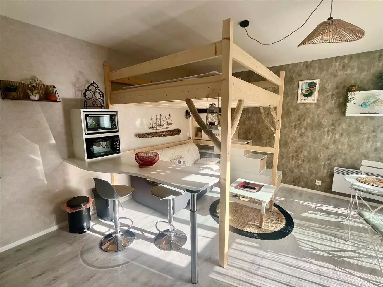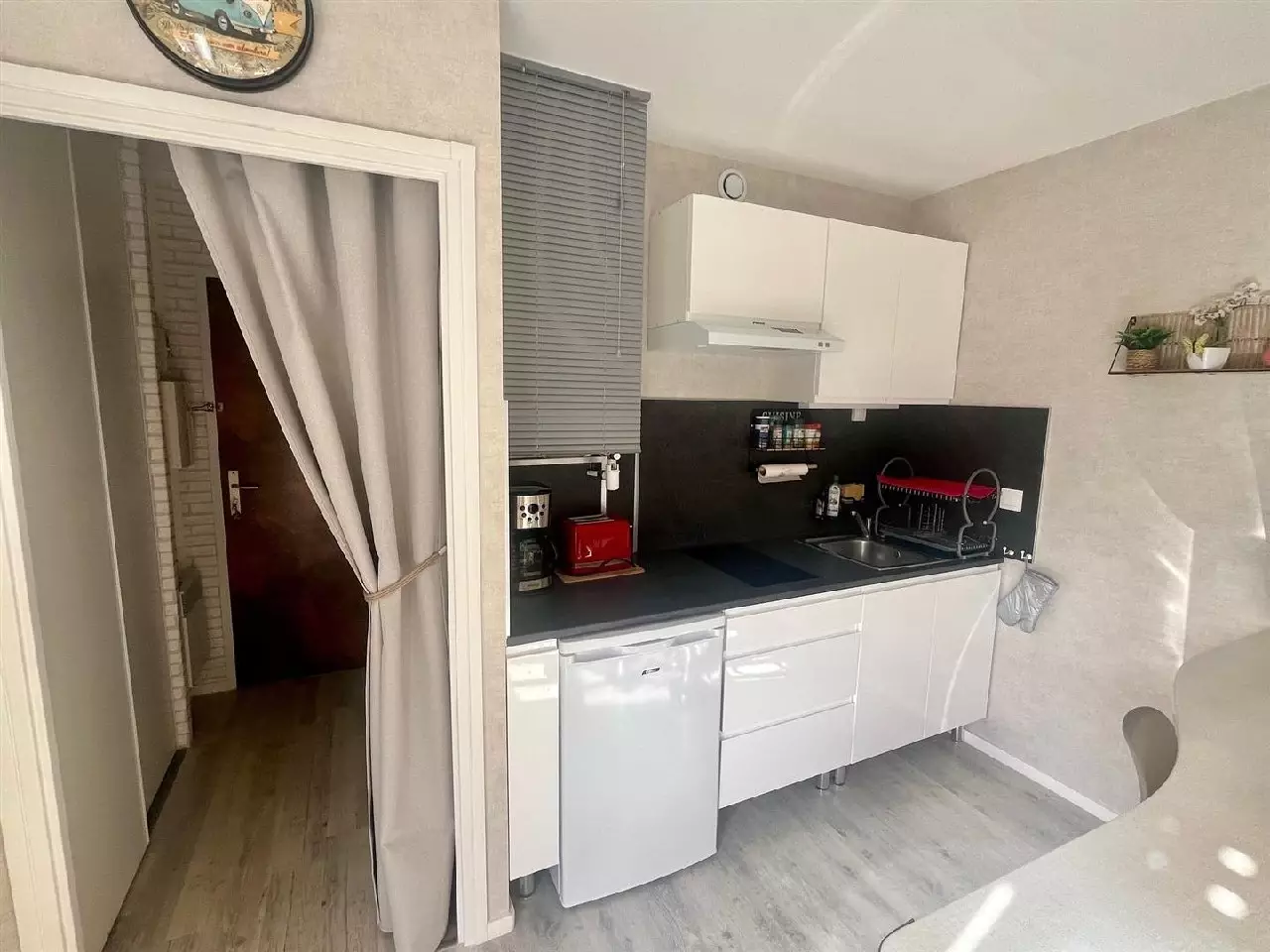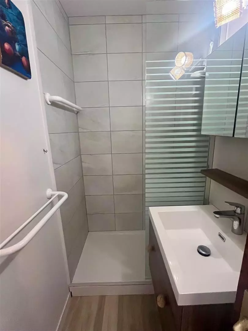 Entrée avec placard, salle d'eau, wc, pièce de vie avec cuisine équipée et espace nuit en mezzanine faite sur mesure.